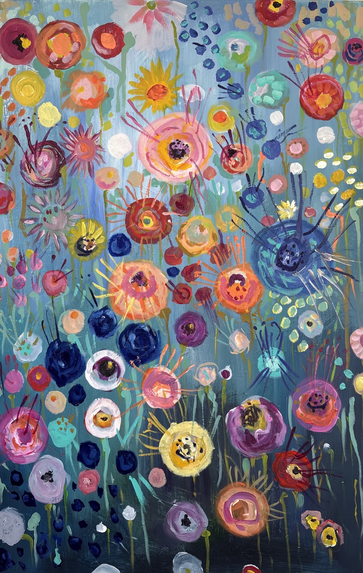 “I’m a Cambridge -based artist and I’ve been making ‘art’ since I was about two! My work is expressionistic, usually sparked by the colours, shapes, and energy of the natural world. I’m lucky to live in beautiful surroundings, and I try to capture some of that vitality and colour in my paintings. I also usually feel pretty grateful just to be here so I think some of that comes through my work too. As is likely obvious, I am not aiming for accuracy or realism, I’m more interested in playful colour, flow, and energy. It’s about mood and feeling rather than detail.”